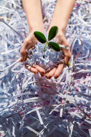 Hands holding a plant growing from cutted pieces of paper. Ecology and recycle concept.