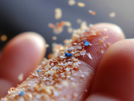 Macro shot of a human finger covered in tiny grains of sand, highlighting the detailed texture and small particles.