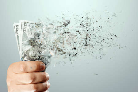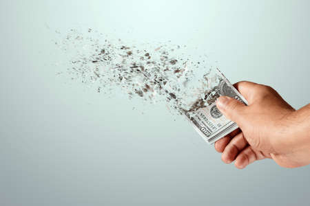 A hand holds a hundred dollar bills that dissolve into thin air. The concept of big expenses, loans, mortgages, big purchases