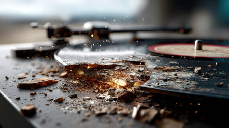 A dynamic close-up of a broken vinyl record on a turntable. Dust and sparks create a visual narrative of music