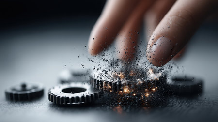 A surreal scene shows a hand interacting with gears, producing sparks and dust, symbolizing creativity and technology in a dynamic setting.