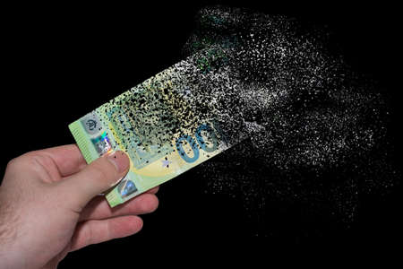 single euro bank note held in one hand decomposes and dissolves due to inflation with black background