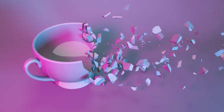 cup for tea in neon light collapsing into small parts, 3d illustration