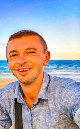 Male tourist Traveling man taking selfie photo on the beach in Playa del Carmen Quintana Roo Mexico.