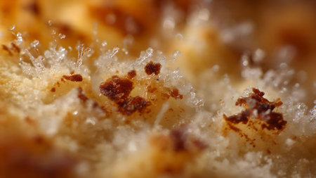 Extreme close-up of sugar crystals and caramelized bits on a sweet baked good, highlighting texture and detail.