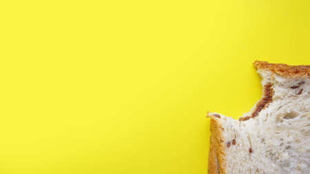 Bitten Toast on yellow background - sandwich with chocolate spread. Background for breakfast. View from above - Copy space photography.