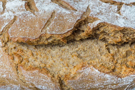 Baked bread of sourdough. Bread crust. Close up. The bread of sourdough, homemade and natural creation. The sourdough has natural yeast, which makes the food healthier, as well as rich.