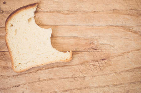 A flat lay of a slice of bitten white bread on a wooden table with space for your text