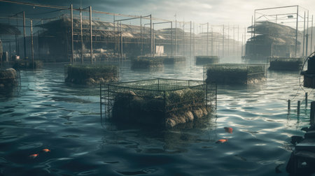 Fishing on the seashore, a view of a fish farm from a drone, reproduction of fish on feprms, generative AI.