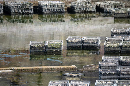 Oysters growing systems, keeping oysters in concrete oyster pits, where they are stored in crates in continuously refreshed water, fresh oysters ready for sale and consumption on farm in Yerseke, Zeeland, Netherlands