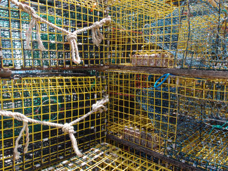 Closeup detail of lobster pots on a seaside harbor quayside