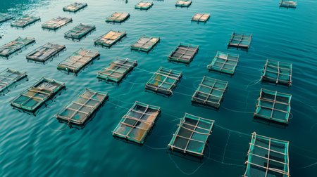 Floating Fish Farms Provide Sustainable Seafood in Tranquil Blue Waters at Midday in a Coastal Region. Generative AI