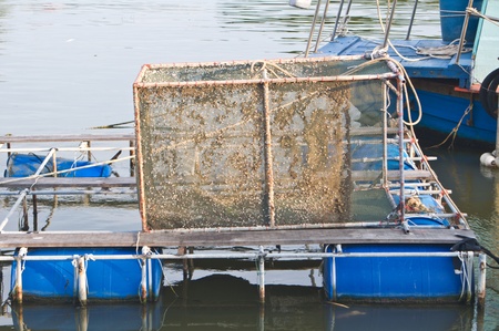 fishing nets in the form of a round cage in water