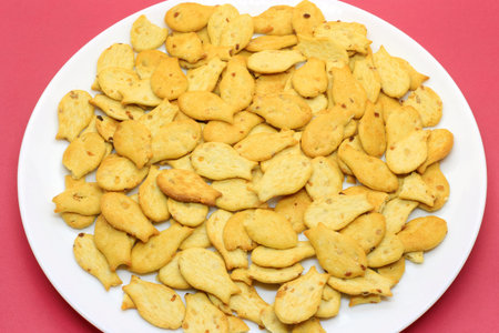 Tasty fish-shaped cookies in a white plate closeup on a crimson background