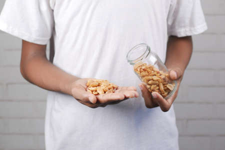 Scattered hazelnuts in caramel on a white background. Very tasty and healthy and high-calorie dessert. Walnut inscription