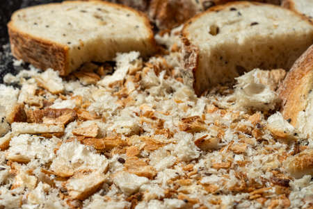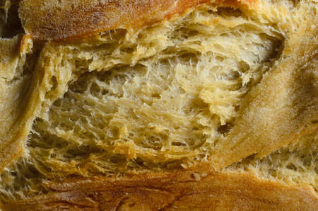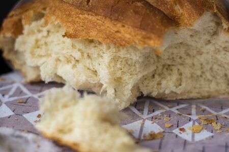 broken crust of fresh fragrant bread close-up, food product confectionery