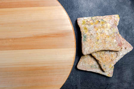 A man holds a piece of moldy bread against a black background. A grown man's hand with a stale piece of wheat loaf.