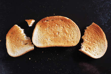 Crackers, dried baked bread pieces on dark background, selective focus.