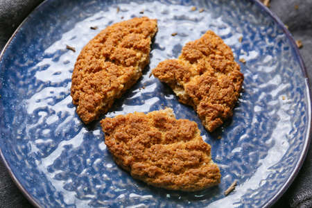 Healthy Fresh Baked Cookies with Sesame cracked on Two Halves on Blue Background. Close up.