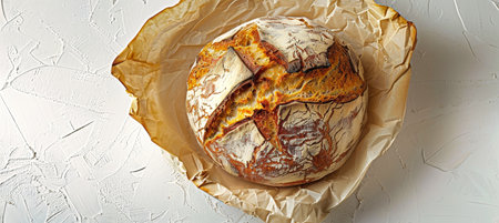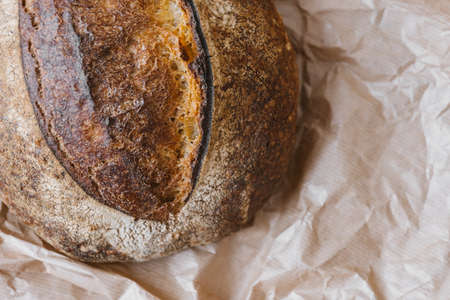 Freshly baked homemade sourdough bread on baking paper over white background.