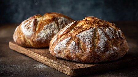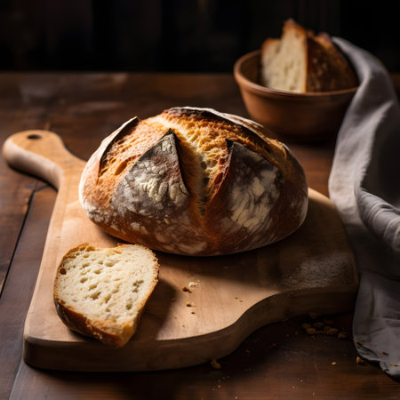 This image features a freshly baked artisan bread resting on a wooden board. It captures the texture and warmth of homemade baking, perfect for culinary delights.