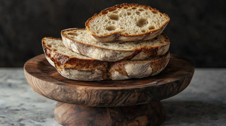 This image presents a freshly baked loaf of bread, artfully sliced to reveal its interior texture. The composition highlights the bread's golden-brown crust and airy crumb structure. The lighting appears soft, possibly natural, setting the stage for use in various culinary or food-related publications or promotional materials.