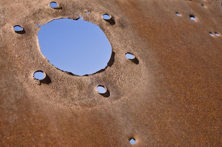 A rusty texture of a huge container with holes in it. Keanes' Wonder Mine, Death Valley National Park