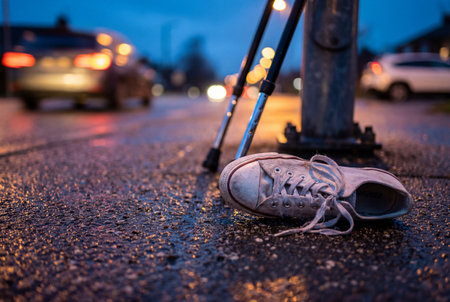 A single worn white sneaker lies on the damp gritty asphalt next to a metal crutch leaning against a post while blurred car lights shine in the background during twilight.