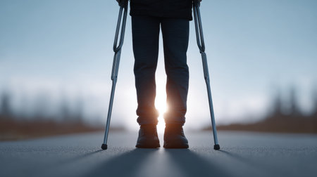 A person using crutches stands on an empty road as the sun sets in the background, embodying a powerful message of resilience and courage in the face of challenges.