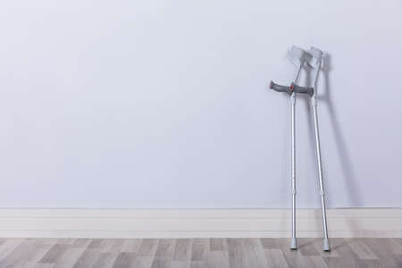 Crutches on white wall background.