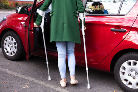 Disabled Young Woman With Crutches Opening Door Of A Red Car