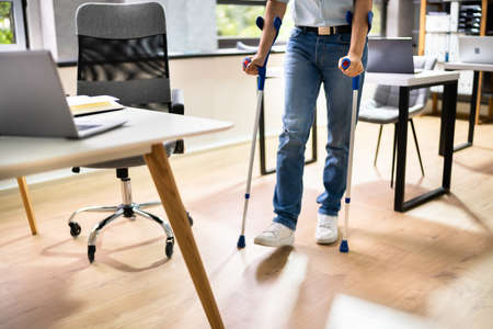 Worker With Crutches At Workplace Or Office. Handicap Rehabilitation Benefits