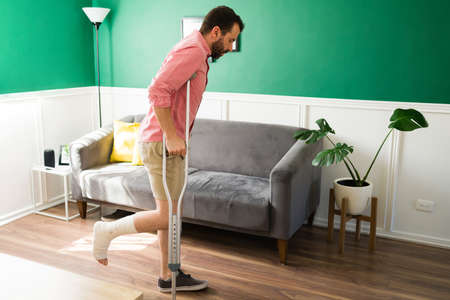 Injured man trying to walk on crutches. Rehabilitation of a broken leg at home.