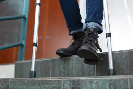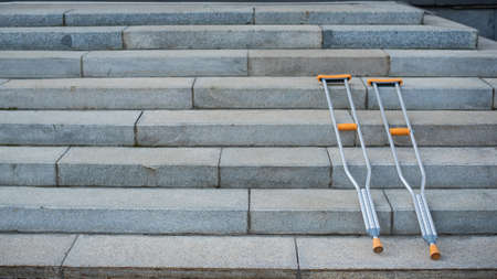 Pair of crutches for a man with an injury on the stairs.