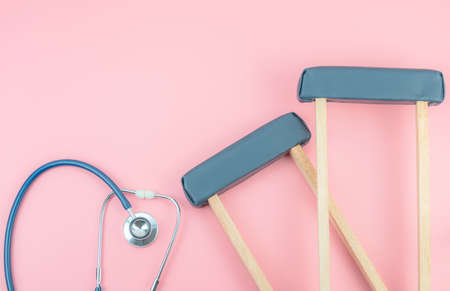 Top view with copy space of Crutchs and stethoscope on the pink pastel background, Flat lay and Healthy concept