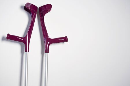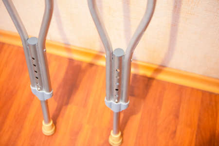 Crutches near the wall. Two crutches standing at the wall. Fractures of the legs. Concept - goods for the disabled. Sale of medical equipment. Equipment for the disabled. Place for an inscription.