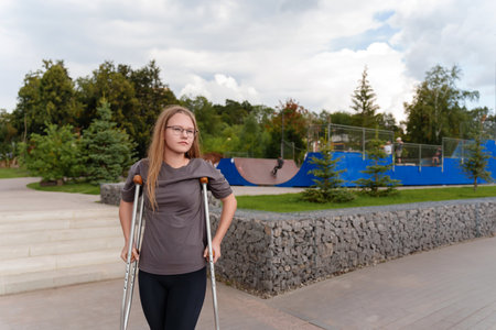 young woman, her crutches a symbol of resilience, stands tall amid the skate park backdrop, her gray t-shirt serving as a canvas for inspiring messages