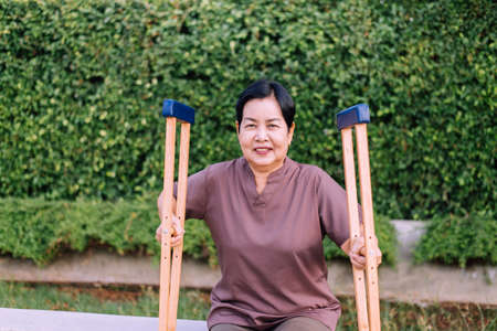 Patient mature asian woman using crutches support broken legs for walking at outdoor,Physical therapy concept