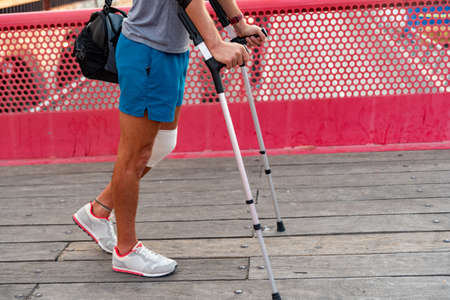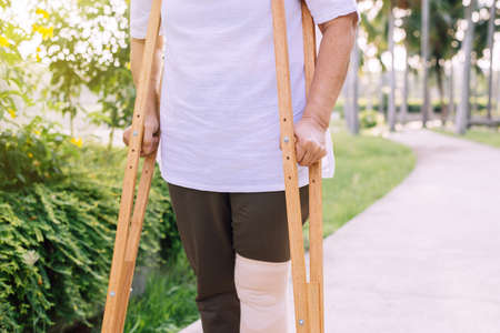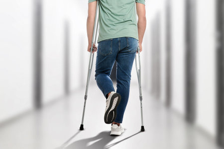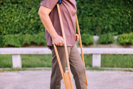 Close up of man using crutches. Disability and rehabilitation.