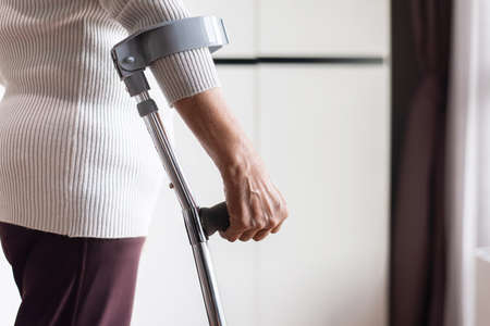 Senior woman using crutches support walking at home,Rehabilitation and recovery concept