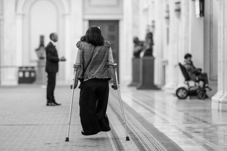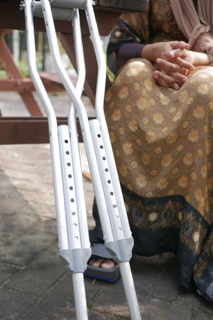 Shallow depth of field (selective focus) details with a woman using crutches.