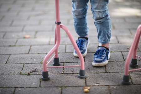 Unrecognizable young man with crutches walking in the city