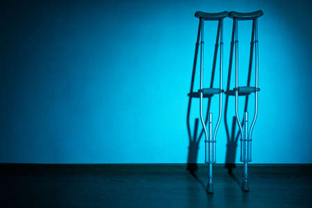 Crutches. Fractured legs. Crutches as a sign of disability. Symbol of disability. Rehabilitation in case of injury. Concept - workplace injury. Life with disabilities. Personal injury. Injuries.