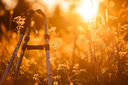 A pair of crutches is seen resting in a field of tall grass, showcasing the contrast between man-made objects and the natural environment, Crutches bathed in warm sunset light, AI Generated