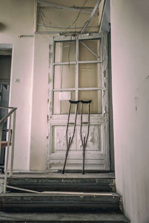 Crutches are in an old abandoned hospital. Staircase in an abandoned building. Shabby walls.