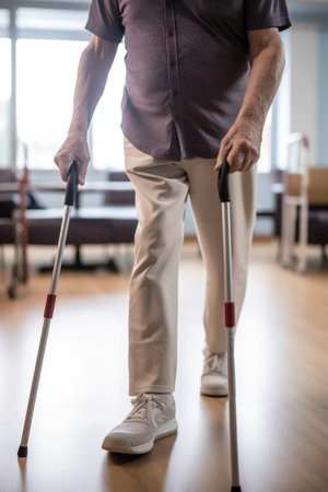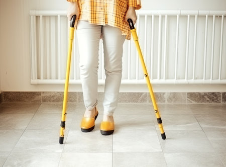 A visual of supportive equipment like crutches and a walker arranged neatly at the side of a rehabilitation room signifying the tools used during the recovery journey towards regainin
