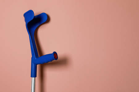Elbow crutch on pale pink background. Space for text