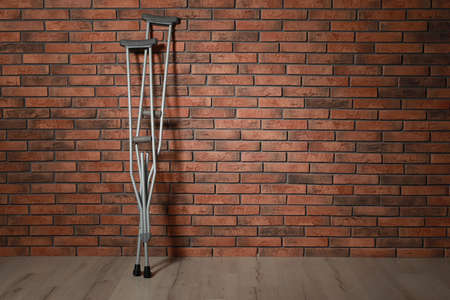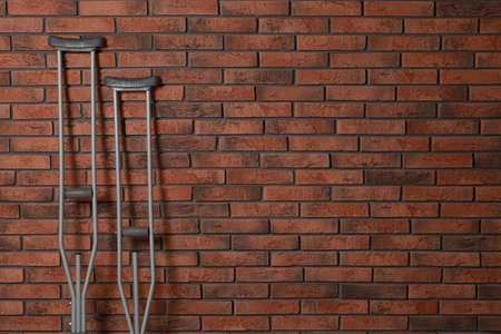Pair of axillary crutches near red brick wall. Space for text