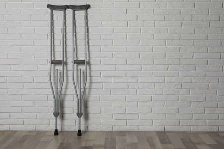 Pair of axillary crutches near white brick wall. Space for text