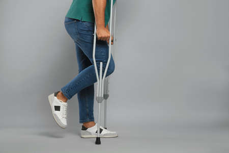Young man with axillary crutches on gray background, closeup. Space for text